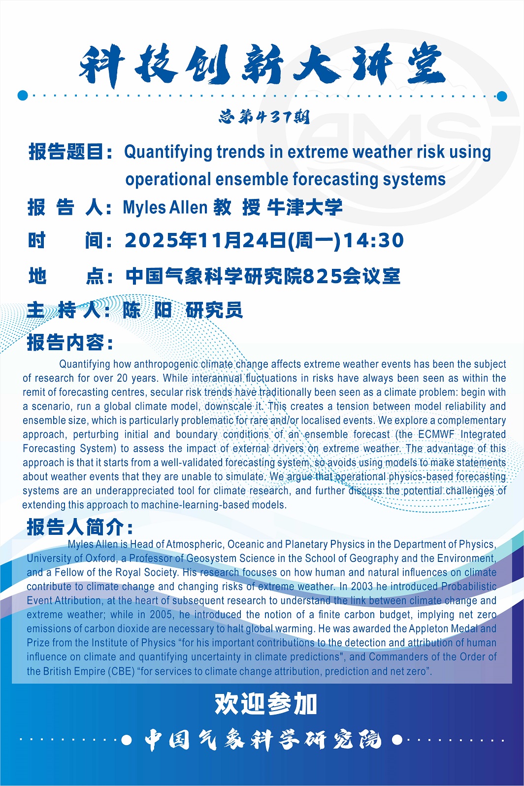 > 【科技创新大讲堂第437期】-Quantifying trends in extreme weather risk using operational ensemble foreting systems(Myles Allen)