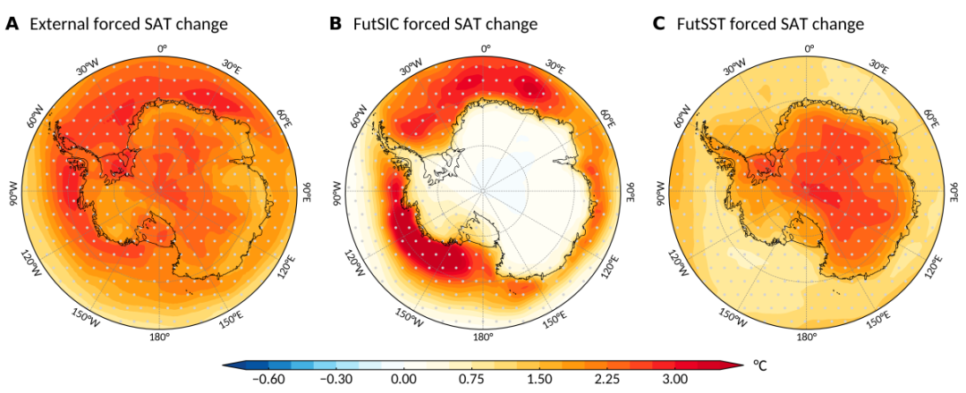 图1. 未来2°C增暖情景下南极地区的气温响应。(A)外部强迫,(B)海冰强迫,(C)海温强迫。