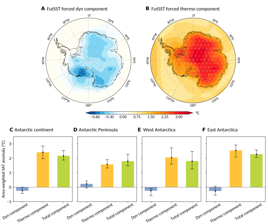 CMIP6多模式结果表明,在《巴黎协定》设定的2℃温升情景下,整个南极地区将出现稳健的增暖信号,其整体增温幅度是南半球平均的1.4倍。基于PAMIP大样本集合试验结果的分析进一步揭示,未来海温变化在调节这一人为气候响应中发挥着关键的媒介作用(图1)。从物理机制上看,未来海温升高主要通过动力学与热力学两大过程影响南极气温变化,且二者作用效果显著不同。其中,动力学过程主要体现为南半球环状模(SAM)向正相位增强,这通常会导致南极冰盖大部分区域降温;与之相反,热力学过程则通过海洋向大气释放感热与潜热,驱动南极地表的广泛增暖,并在整体气温响应格局中占据主导地位(图2)。该研究不仅深化了对南极气候变化内在机理的认识,也为未来南极气候变化的精准预估提供了关键的理论依据。