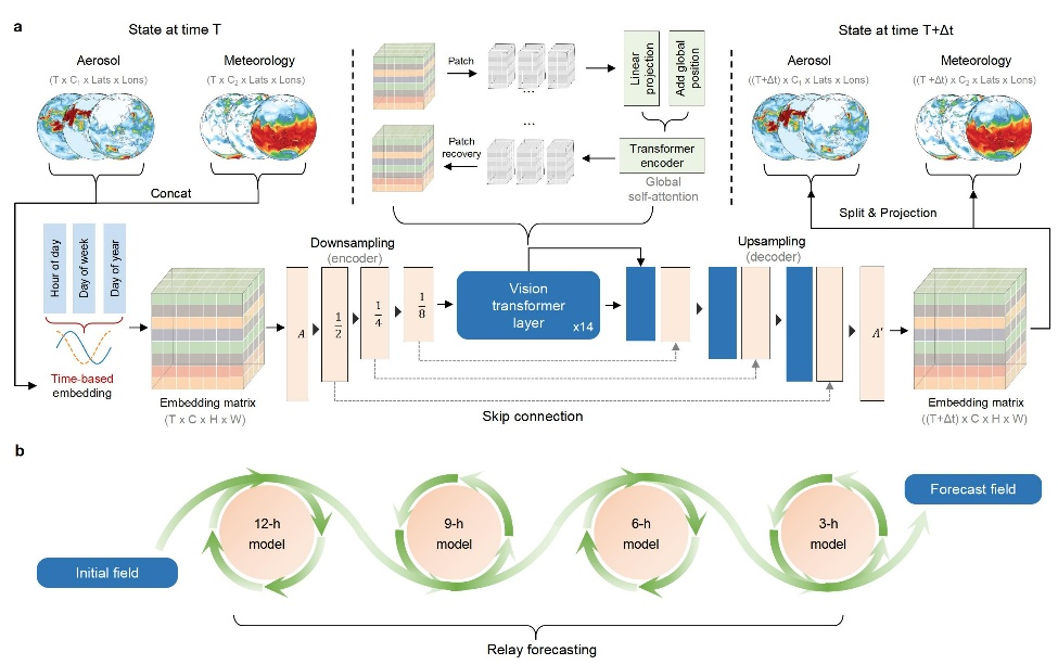 模型于2024年5月启动研发,基于42年全球12万时次气溶胶再分析资料训练,可在1分钟内实现全球范围5天、逐3小时的业务化预报,空间分辨率达50公里,每日可滚动预报8次。