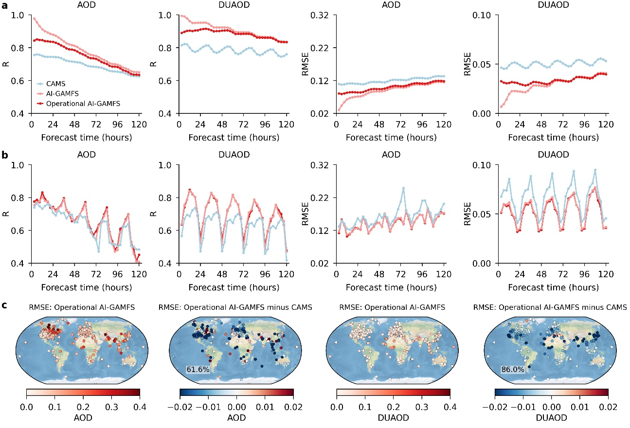 图2. 全球气溶胶光学厚度及沙尘光学厚度5天业务化预报性能:AI-GAMFS与CAMS对比评估