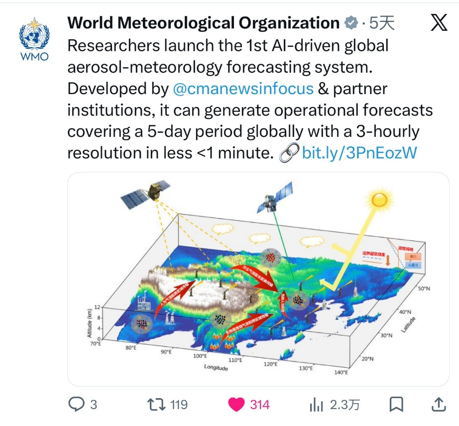 图5. WMO官方X账号转载AI-GAMFS模型发布