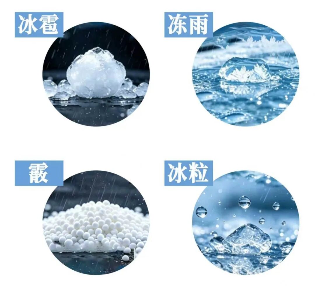 冰雹、冻雨、霰、冰粒对比图 (图片素材来源于千库网,由豆包AI辅助生成)