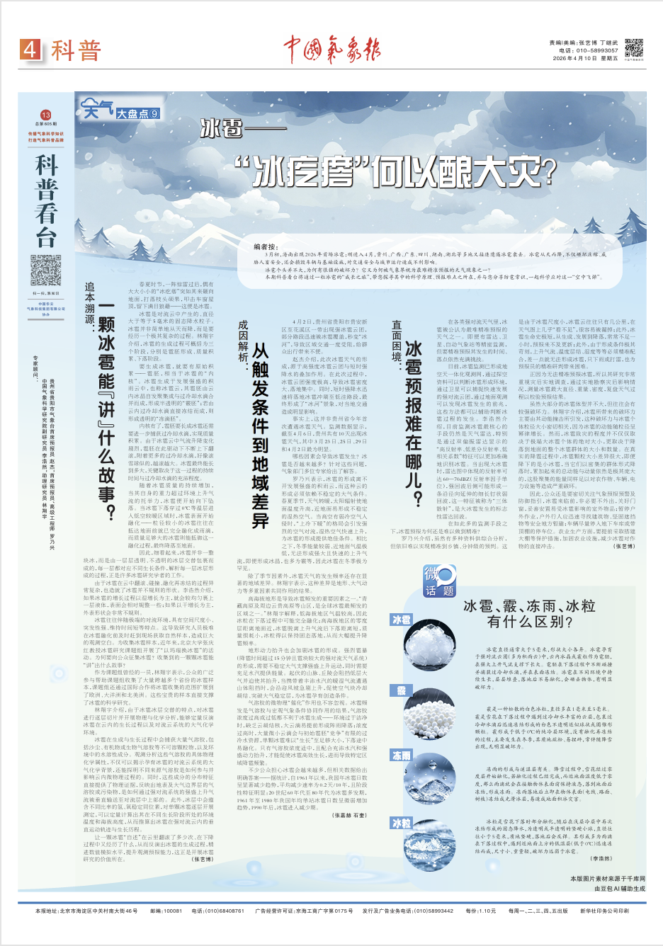 春夏时节,一阵惊雷过后,偶有大大小小的“冰疙瘩”突如其来砸向地面,打落枝头硕果,叩击车窗屋顶,留下满目狼藉——这便是冰雹。