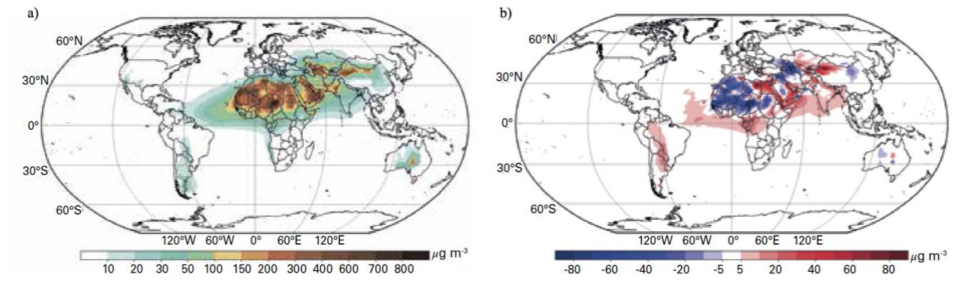 Figure 1. a Annual mean surface concentration of mineral dust in 2019 and b Anomaly of the annual mean surface dust concentration in 2019 relative to the 1981–2010 mean.