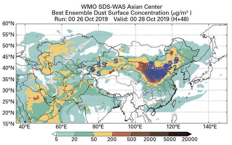 Figure 2: Comparison between observed SDS concentrations and foret dust surface concentrations μg/m3 by best ensemble foret at 0000 UTC on 28 October 2019 from the Asian Node. Blue symbols S indicate the weather stations dust was recorded. Source: Beijing Dust Foret Centre