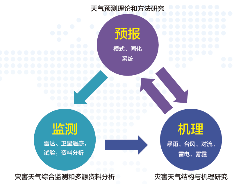 根据国家重大防灾减灾需求,围绕灾害天气监测预测中的前沿科学问题,开展灾害天气形成及演变机理研究;面向监测预报、防灾减灾中的业务需求,发展灾害天气监测、精细定量预测新理论与新技术,研究季风变异机理及预测理论和方法;开展科技成果应用转化。有效支撑气象防灾减灾、区域高质量发展和气象现代化建设,为我国气象防灾减灾能力建设提供有力支撑。